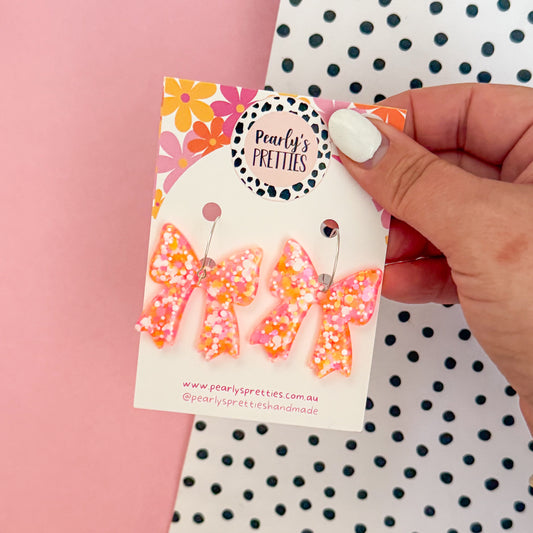 Bonnie Bow dangle hoop earrings- Orange and pink sparkle